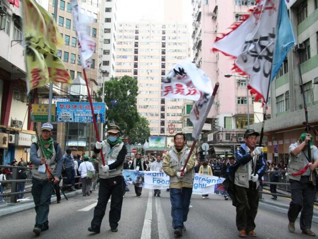 As the World Trade Organization has pursued a free trade agenda, protests have dogged its meetings. Photo shows Korean workers at the WTO’s 2005 Hong Kong Ministerial Meeting calling for sovereignty over food and fisheries. Photo fuzheado (CC-BY-SA 2.0).