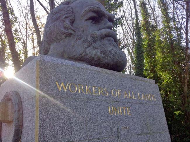The bust of Karl Marx on his grave in Highgate Cemetery, London. The inscription “Workers of all lands unite” is taken from the conclusion of the Communist Manifesto. Photo Workers.