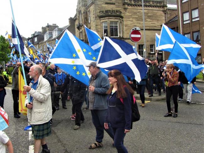 Separatist march, Galashiels, June 2019. Note the incorporation of the EU flag into the Saltire. Photo Workers.