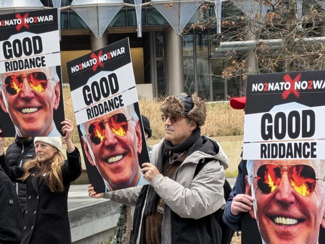 Good riddance to Biden, but US aggression continues. Demonstration outside US embassy, London, 20 January 2025, the day of Donald Trump’s second inauguration. Photo Workers.